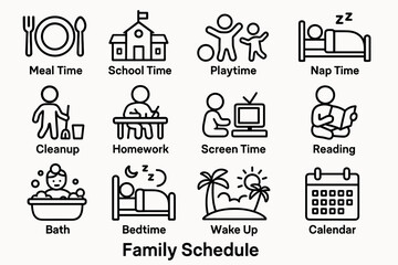 Illustrative family schedule: daily activities for children and parents in icon set