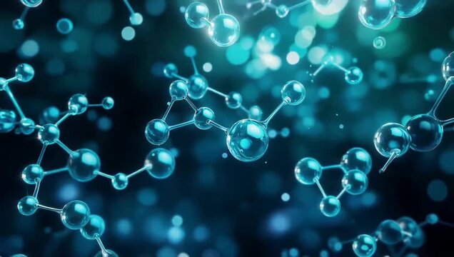 Abstract representation of chemical reactions and molecular structures in blue tones with bubbles and flowing shapes