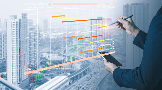Project manager planning schedules for business task on office using gantt chart software display on screen. Modern business management and work flow organization. Trailblazing