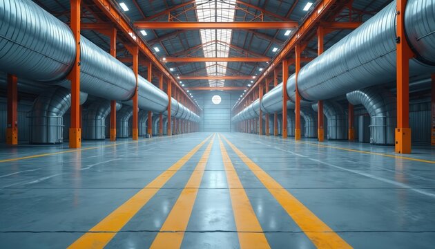 Vast industrial interior with large metal air ducts, orange support beams. Wide open space features polished concrete floor with yellow safety lines, overhead skylights providing bright, even