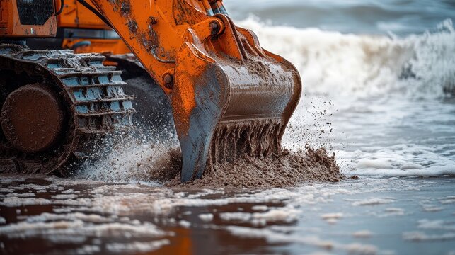 Excavator working on the beach during sunset, creating waves of sand and water under clouds in a vibrant sky