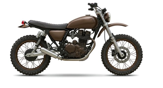 Brown, custom-style motorcycle isolated on white. Features include a circular headlight, knobby tires, a high-mounted exhaust, and a textured seat