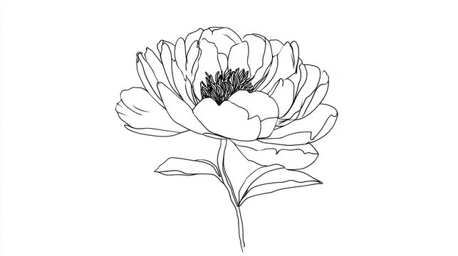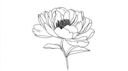 A delicate peony flower is illustrated in fine lines, highlighting its soft petals and structured leaves. The artwork captures the essence of natures charm and elegance.