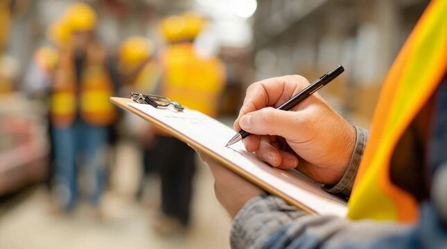Worker filling checklist during safety inspection at construction site with crew in industrial background