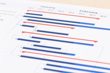 Engineering or project management workflow concept. A site manager reviews a Gantt chart to monitor task planning and progress using scheduling software - part of a corporate construction and operatio
