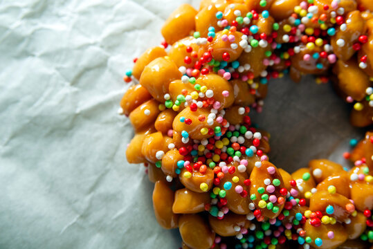Homemade struffoli. Typical Neapolitan dessert of the Christmas holidays with honey and sprinkles