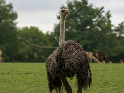 A South African ostrich, Struthio camelus australis, striding through expansive grassland, embodies the majestic essence of its natural habitat.