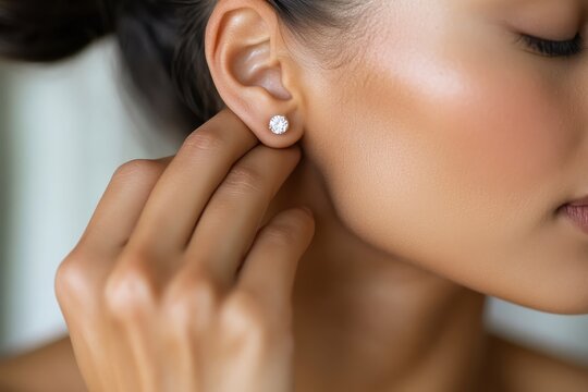 A close-up of a young woman delicately touching her diamond stud earring, showcasing her beauty, grace, and elegance in a softly lit environment.