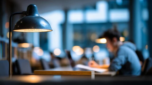 Contemporary library scene shows student deeply engaged in studying beneath stylish desk lamp, highlighting dedication, learning. Soft lighting, blurred background evoke focus, tranquility