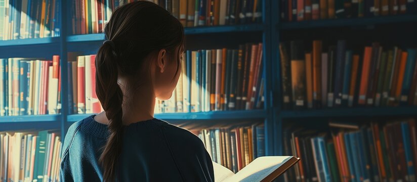 Young woman reading book in library promotes literacy