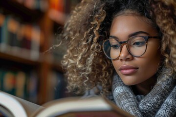 An image of a young woman deeply engaged in reading a book in a library setting, wearing glasses, capturing a moment of intellectual curiosity and academic pursuit.
