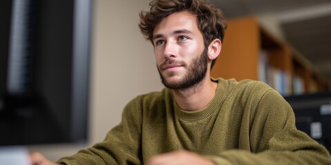 Student engaged in virtual assignment with focused expression in office setting