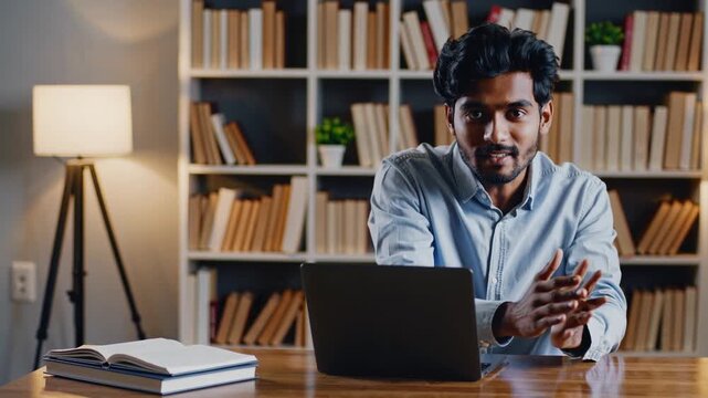 Young man engaged in online study session at cozy workspace with shelves of books