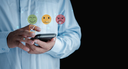 business man use smartphone choosing green happy smile face icon. feedback rating and positive customer review experience, satisfaction survey.