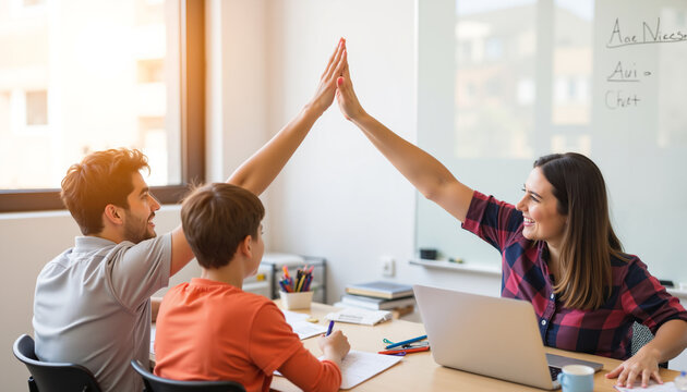 teacher enthusiastically praises student in lively classroom setting, fostering positive learning environment