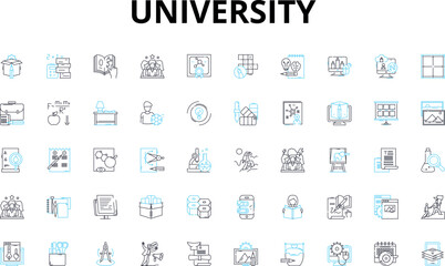 University linear icons set. Academics, Campus, Education, Student, Faculty, Research, Diversity vector symbols and line concept signs. Community,Success,Graduation illustration