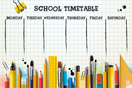 School timetable for kids, educational schedule, weekly planner, printable school schedule for children. School children routine timetable. Education lessons plan, class planning.