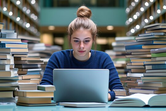 A student studying in a quiet library, surrounded by piles of books and a laptop open in front of them