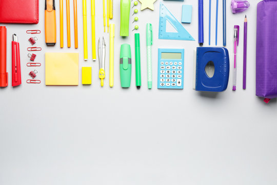 A hand-drawn style background featuring colorful school supplies like pencils, rulers, erasers, and books scattered on a white backdrop.