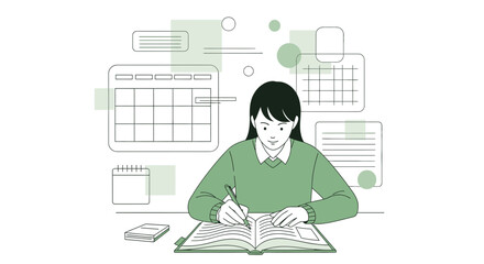 A Student Working With A Pen and Paper, Surrounded by Schedule Elements Illustrations