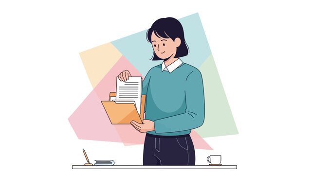 Young woman organizing documents in a folder with a laptop and coffee on desk
