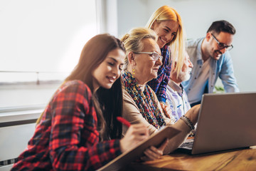 Young volunteers help senior people on the computer. Young people giving senior people introduction to internet