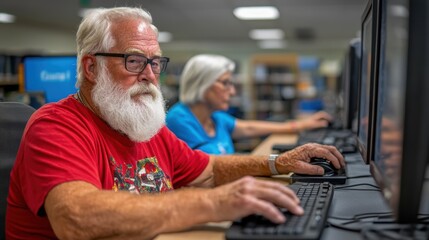 An elderly man with glasses and a white beard focuses intently on a computer keyboard in a library, participating in a community computer class alongside a woman at another station
