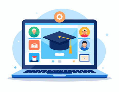 Online learning platform featuring a graduation cap on a laptop screen with student avatars and video call windows