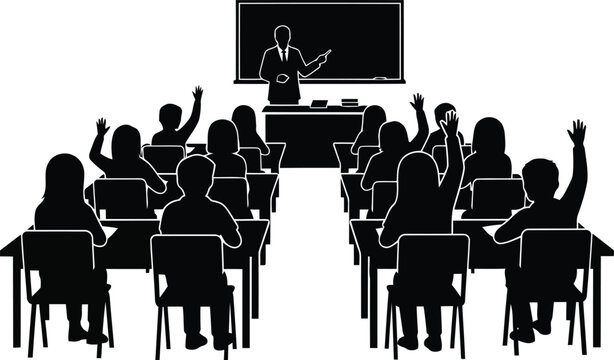 A teacher is teaching math to a class of happy children. The students are raising their hands eagerly, showing excitement and interest in learning.