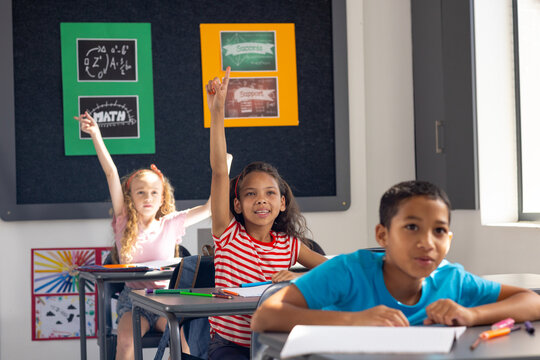 Enthusiastic young children raising hands in classroom for learning