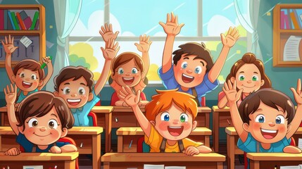 A well-lit classroom setting with a teacher in the front, teaching a group of students who are actively engaging by raising their hands, symbolizing participation in education.