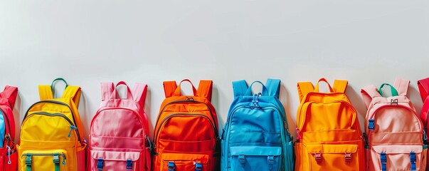 Colorful row of backpacks lined up against a white background for back to school