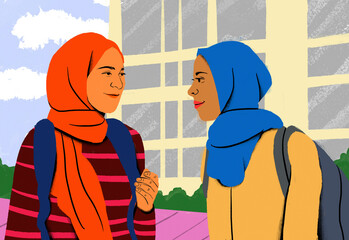 Two smiling women wearing hijabs and backpacks are engaging in a friendly conversation against the backdrop of a building.