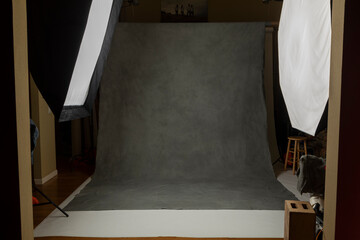 Photo studio set with lightboxes and painted muslin background