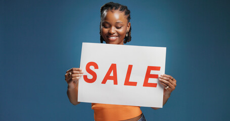 Happy, black woman or discount with sale sign for marketing on a blue studio background. Female person, promoter or model with poster, billboard or advertising for offer, shopping deal or low price