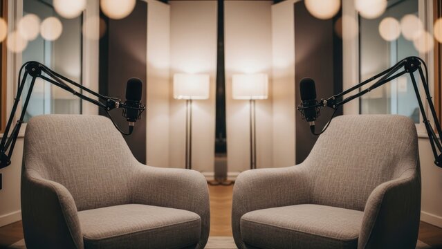 Video interview, conversation recording between journalist holding microphone and female guest. Two women sitting on couch in professional TV studio to record live event. Journalism, movie concept