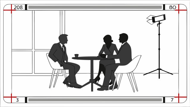 Studio filming three people interview business meeting film production talk show professional discussion corporate video news broadcast media production television show interview set b.