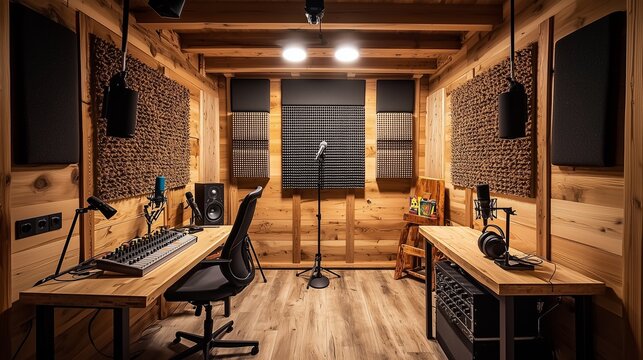 A cozy modern podcast recording studio with professional equipment, featuring soundproofing panels, microphones, a mixing console, and ergonomic chairs.