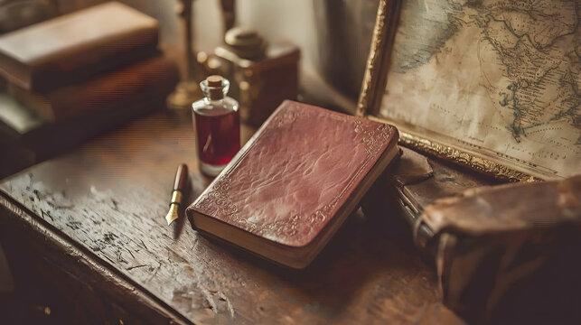 Antique leather journal, inkwell, and map on wooden desk, vintage study setting; ideal for history, writing, or travel blogs