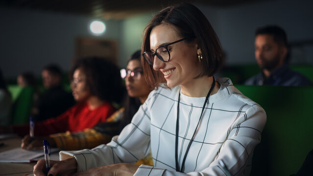 Young student woman student using laptop elearning, remote working at home office looking at computer watching webinar, virtual learning, having video conference call hybrid meeting, writing notes.