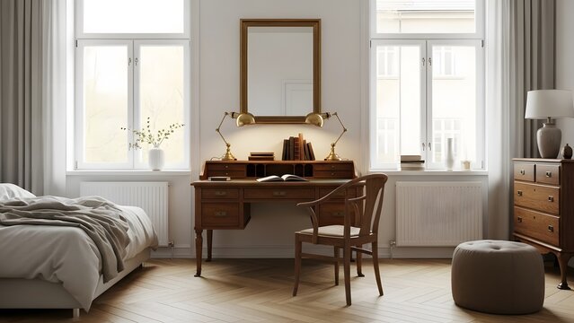 Scandinavian study room with minimalist bookcases, sleek desk, natural light, and cozy atmosphere