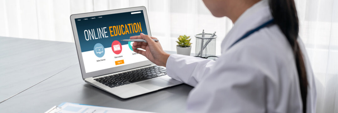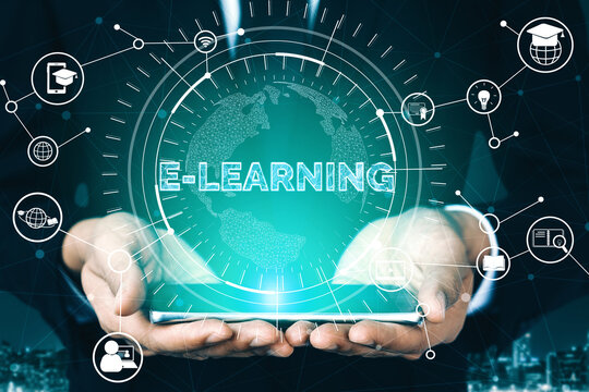E-learning and Online Education for Student and University Concept. Graphic interface showing technology of digital training course for people to do remote learning from anywhere. uds