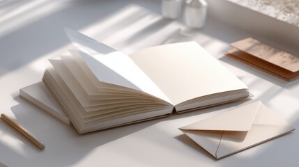 Open blank notebook with envelopes and pencil on sunlit desk for creative inspiration