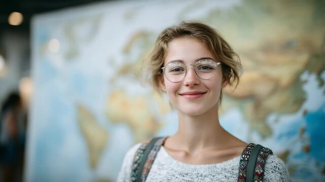 A confident female student with glasses and a stylish backpack explores a vintage world map, envisioning study abroad and internship opportunities.
