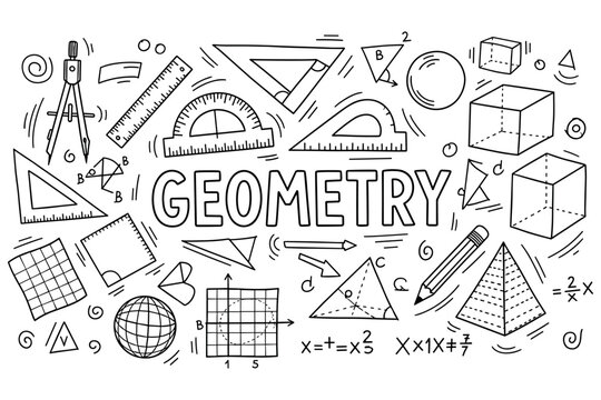 Geometry tools and shapes: ruler, compass, protractor, triangle, grid