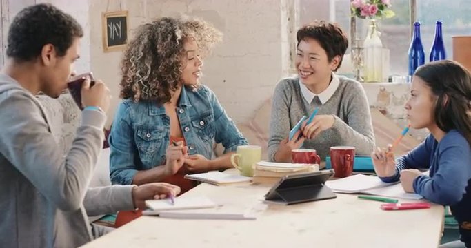 Side view of focused female employee scrolling on tablet and doing case study with her team.