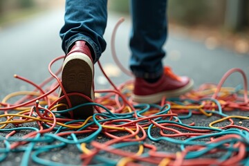 Feet tangled up in colorful wires leading to a chaotic and abstract stumble and fall