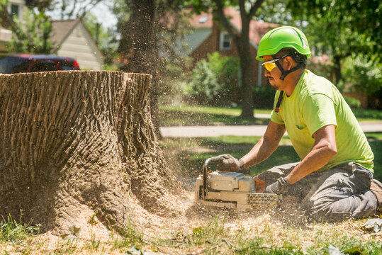 Tree removal worker cutting wood stump