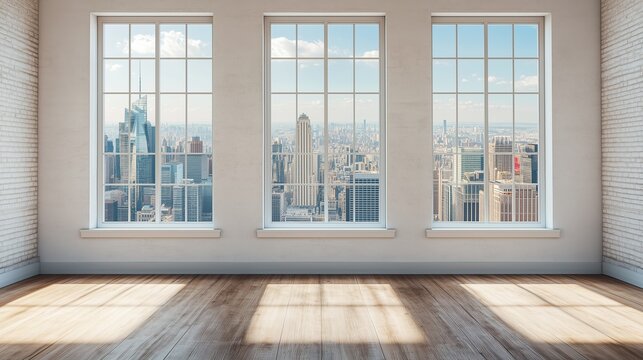 Interior view of an empty room in a skyscraper, showcasing the cityscape during the day. The skyline view from a high-rise window offers a gorgeous property with a stunning view.