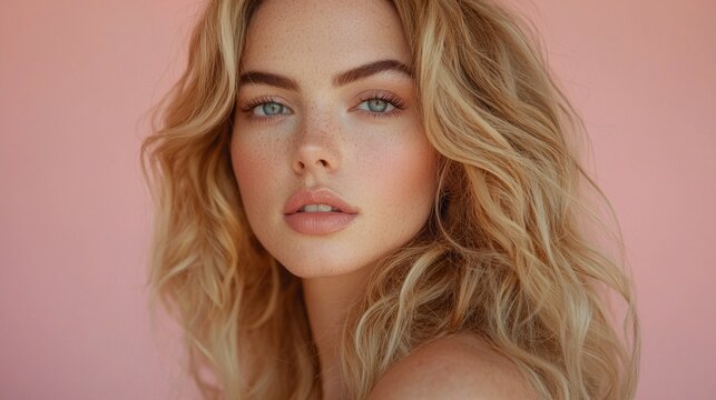 Close-up portrait of a stunning woman, featuring wavy blonde hair, blue eyes, and an orange background, highlighting beauty and simplicity.